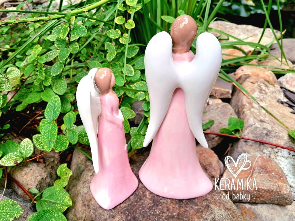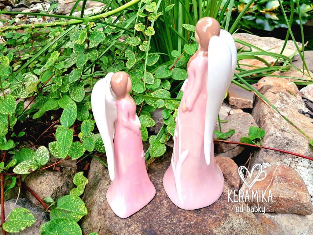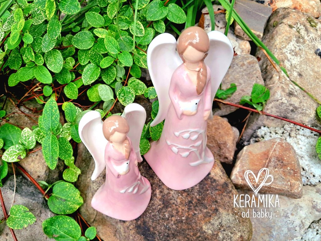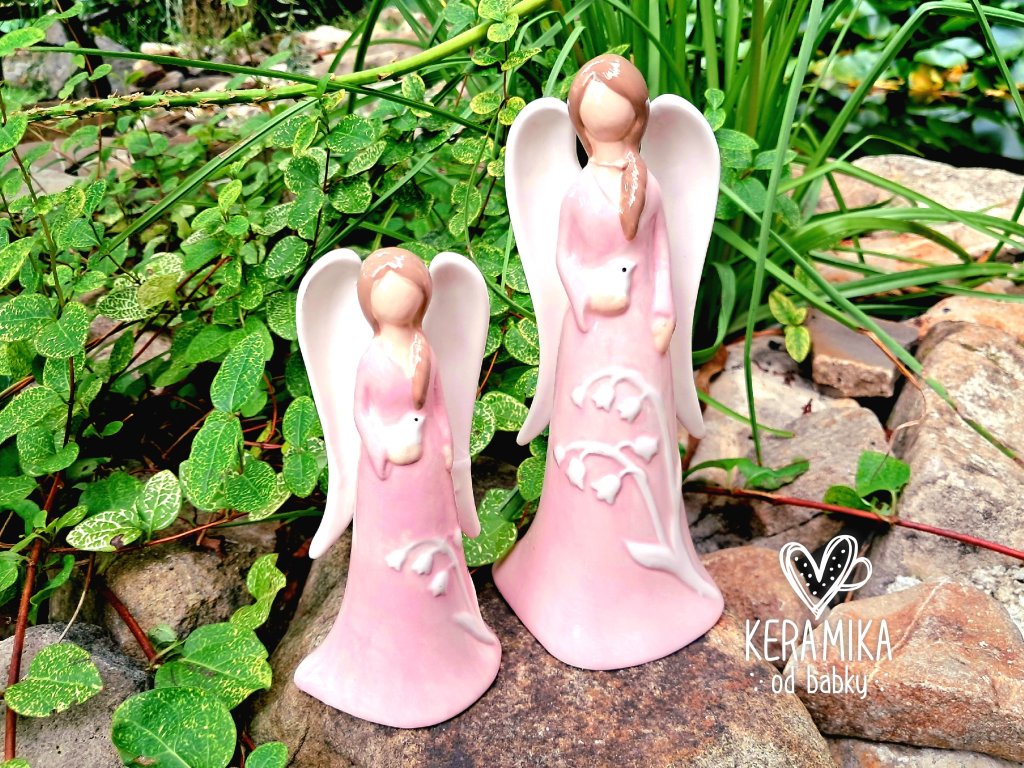 Porcelánový anděl s dlouhými křídly a ptáčkem v ruce. Nabízíme jej ve dvou velikostech, v růžovo bílé nebo bílo růžové kombinaci. Anděl má světle hnědé vlasy a šaty zdobené motivem konvalinek. Malý je vysoký 13cm a větší 17,5cm