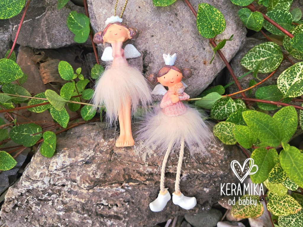 Andílek v růžové barvě se střapatou sukničkou, dva druhy. Andílek k zavěšení má ruce pod bradou, délka andílka 10cm, se zlatou šnůrkou 17cm. Andílek na posazení drží sovičku a je vysoký 6cm od sedu, celkově s nožičkami cca 12cm. Vyrobeno z polyresinu, dovozce Edwilan.