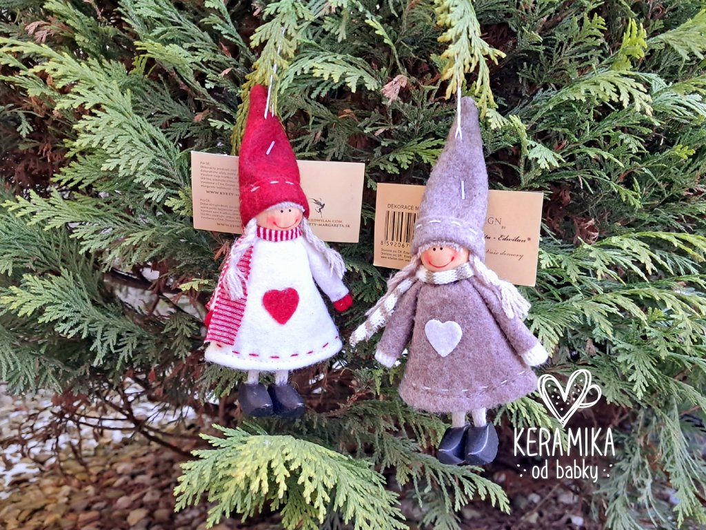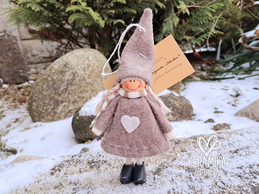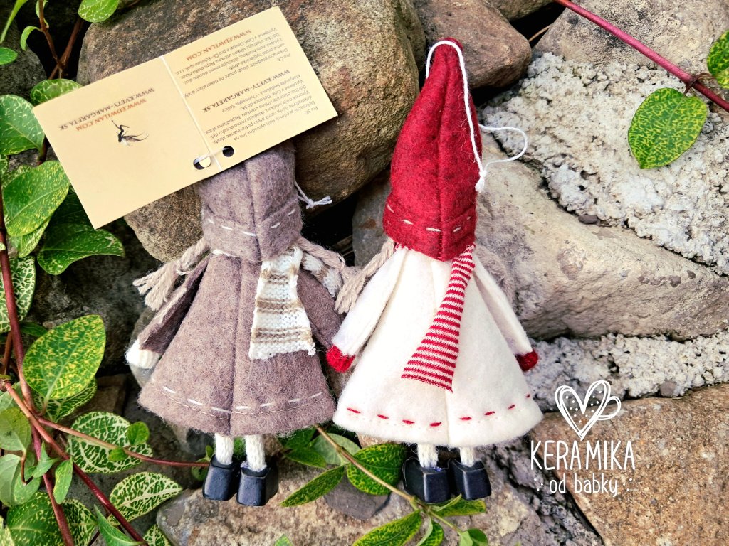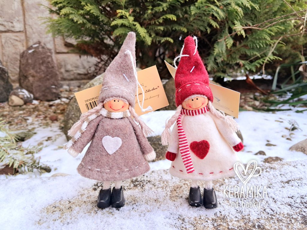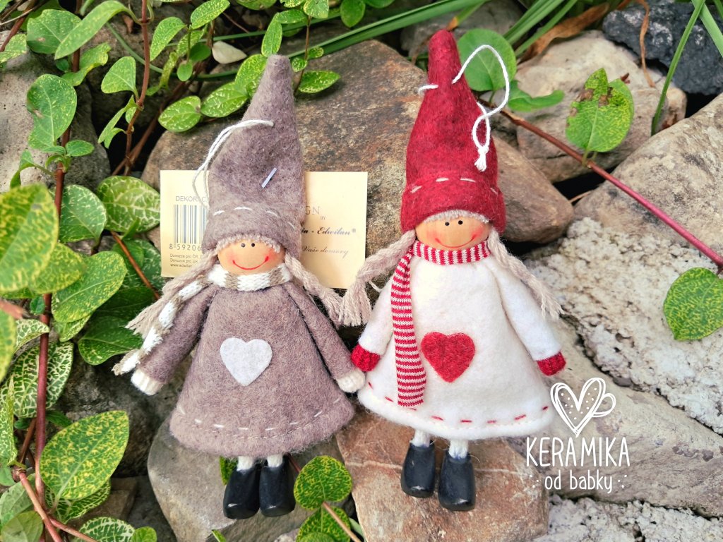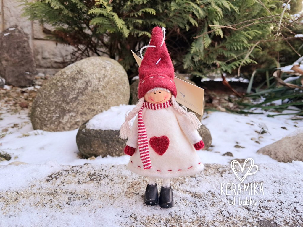 Usměvavý skřítek v červenobílé nebo šedobílé kombinaci vhodný na postavení nebo zavěšení. Dřevěná hlavička, ručně šité plstěné šaty, pletená šála a dřeváky jsou poctivě do detailu vypracované. Výška 15cm, šířka cca 7cm. Dovozce fa Edwilan