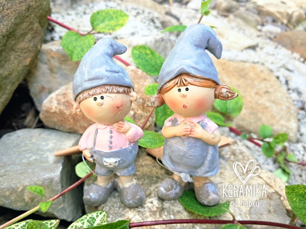 Roztomilí malí trpaslíci, kluk a holka v šedo růžových šatech. Figurky jsou vhodné na dekoraci truhlíků a jiných aranžmá... Nabízíme samostatně nebo v cenově výhodné sadě obou figurek. Výška 8cm, vyrobeno z polyresinu, dovozce fa Edwilan