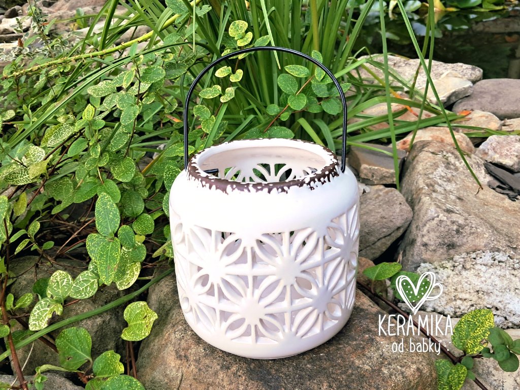 Keramická lucerna s výřezy po celém obvodu a ouškem na zavěšení. Kovové ouško je natřeno černou barvou, lucerna je bílá se zajímavým hnědým zdobením na horním okraji. Výška lucerny je 11cm, výška s ouškem 19cm a má průměr 12cm.