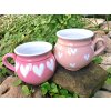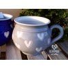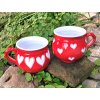 Barevný keramický hrnek s vysoce lesklou glazurou, na povrchu zdobený bílými malovanými srdíčky. Nabízíme v červené, světle a tmavě modré, růžové, starorůžové a šedé barvě. Srdíčka tvoří dva vzory, větší v řadě kolem celého hrnku nebo malé srdíčka po celém hrnku. Ruční práce, každý kus je originál. Možno mýt v myčce. Výška 11cm, průměr cca 12cm, objem 600ml. Ruční práce, vyrobeno v České republice