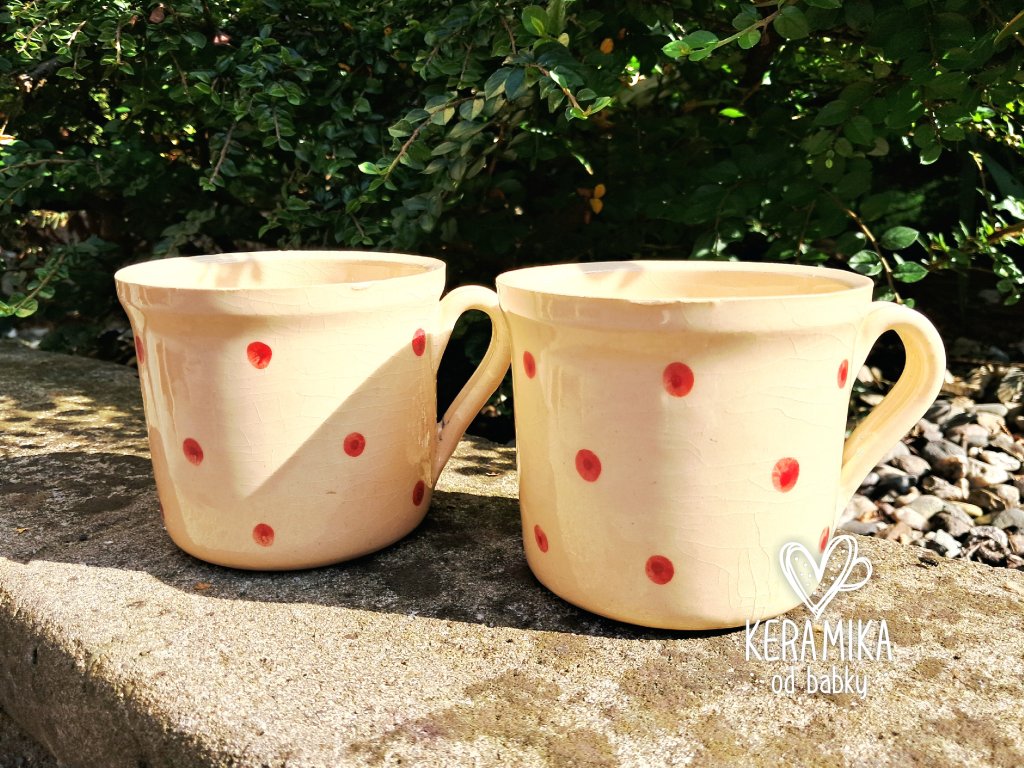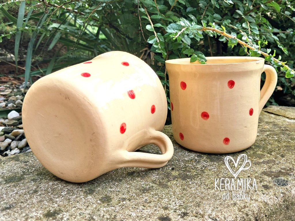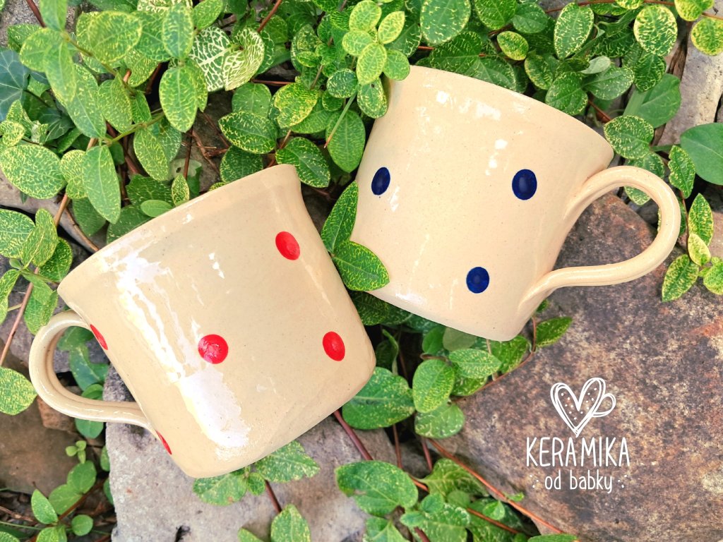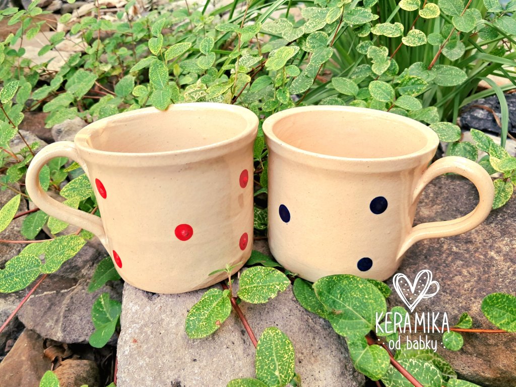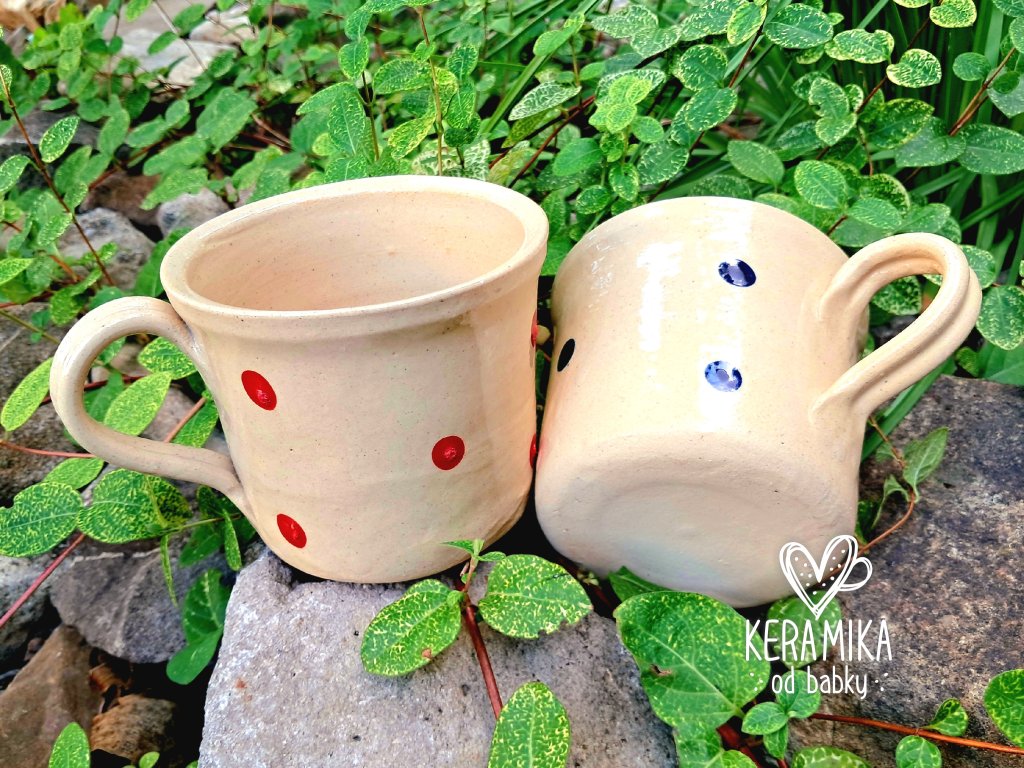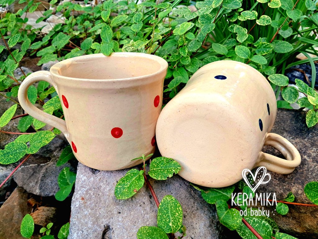 Keramický hrníček smetanové barvy s malovanými modrými nebo červenými puntíky, objem 0,4l