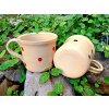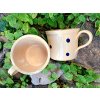 Keramický (kameninový) hrníček smetanové barvy s malovanými modrými nebo červenými puntíky, objem 0,4l. Ruční práce, každý kus je originál a může se nepatrně lišit. Možno mýt v myčce. Výška 8,5cm, průměr 9,5cm. Vyrobeno v České republice, Keramika Dub