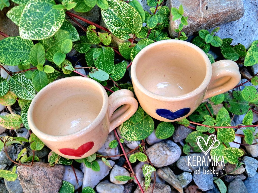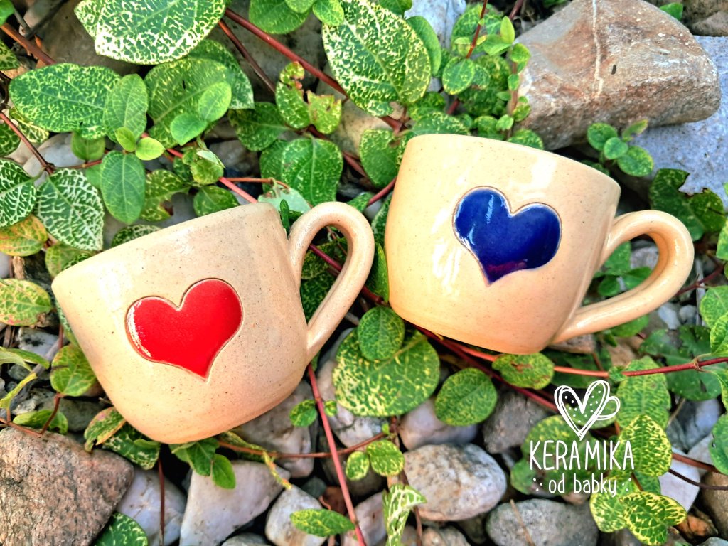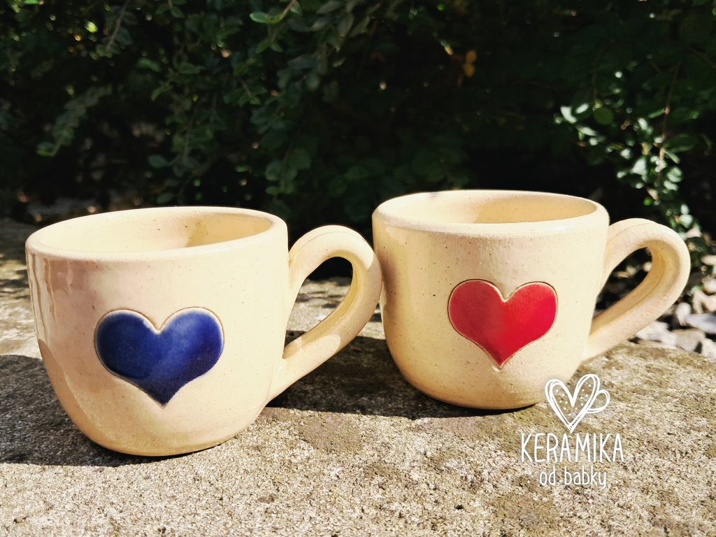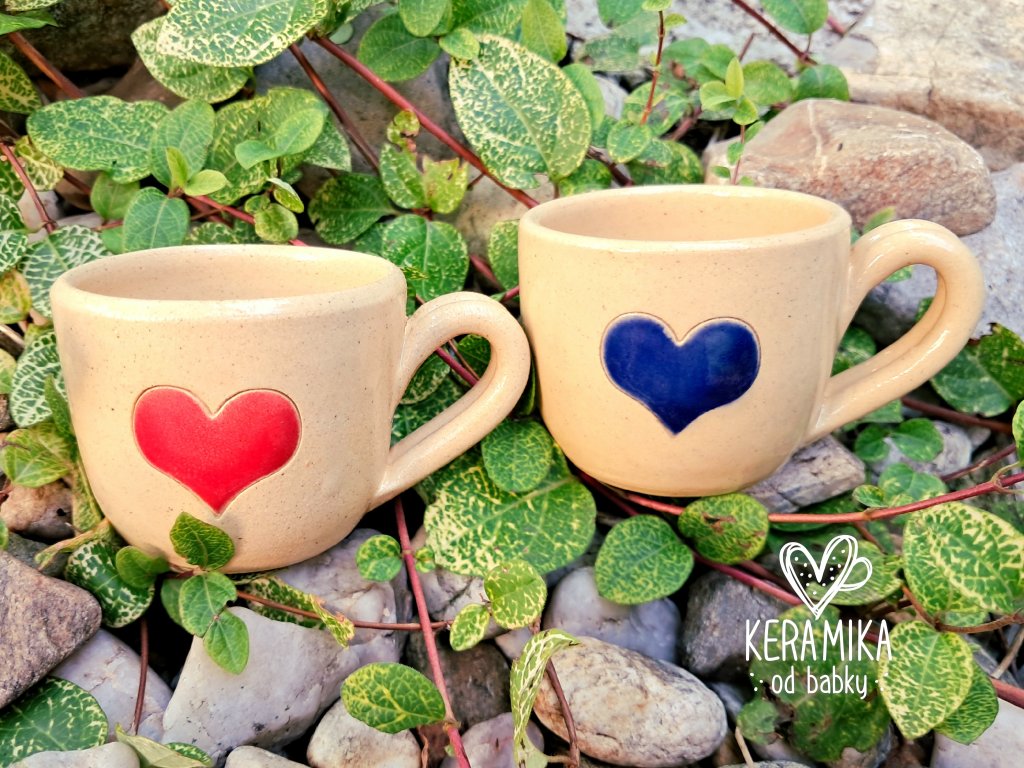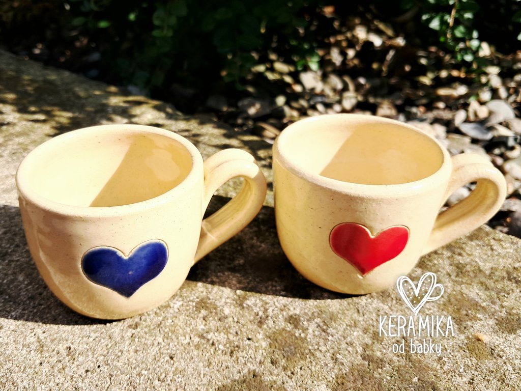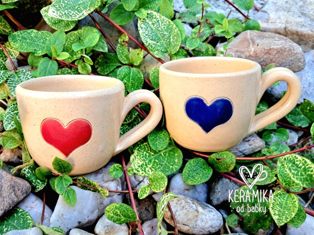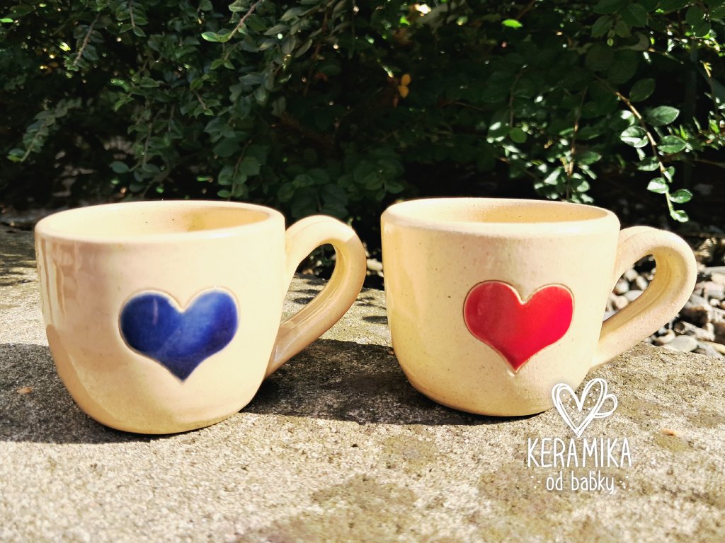 Malý keramický hrníček na ristretto ručně točený se srdíčkem. Barva smetanová, na jedné straně červené nebo modré srdíčko. Objem cca 90ml, horní průměr hrníčku 6cm a výška cca5cm. Vhodný do myčky i mikrovlnky, výrobce Keramika Dub