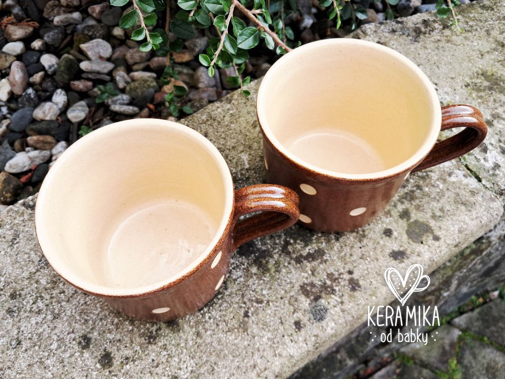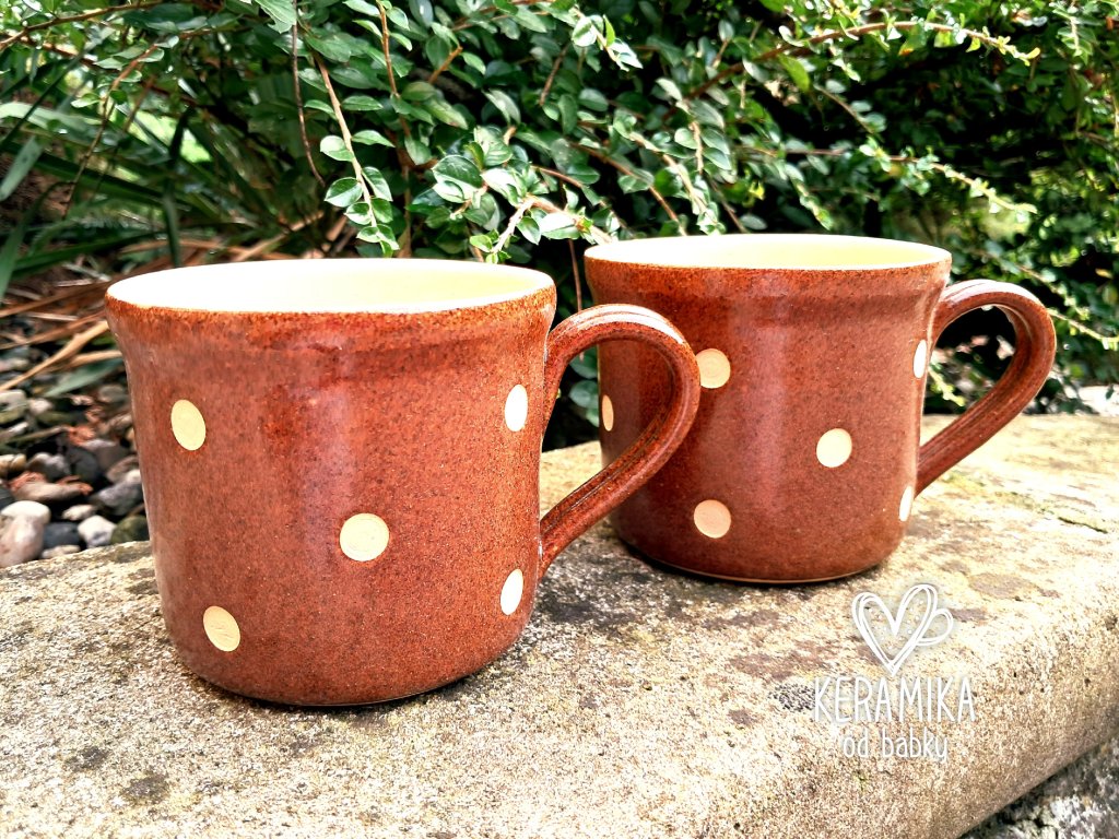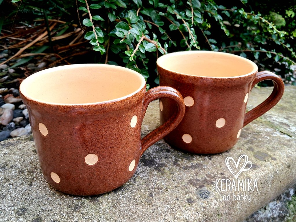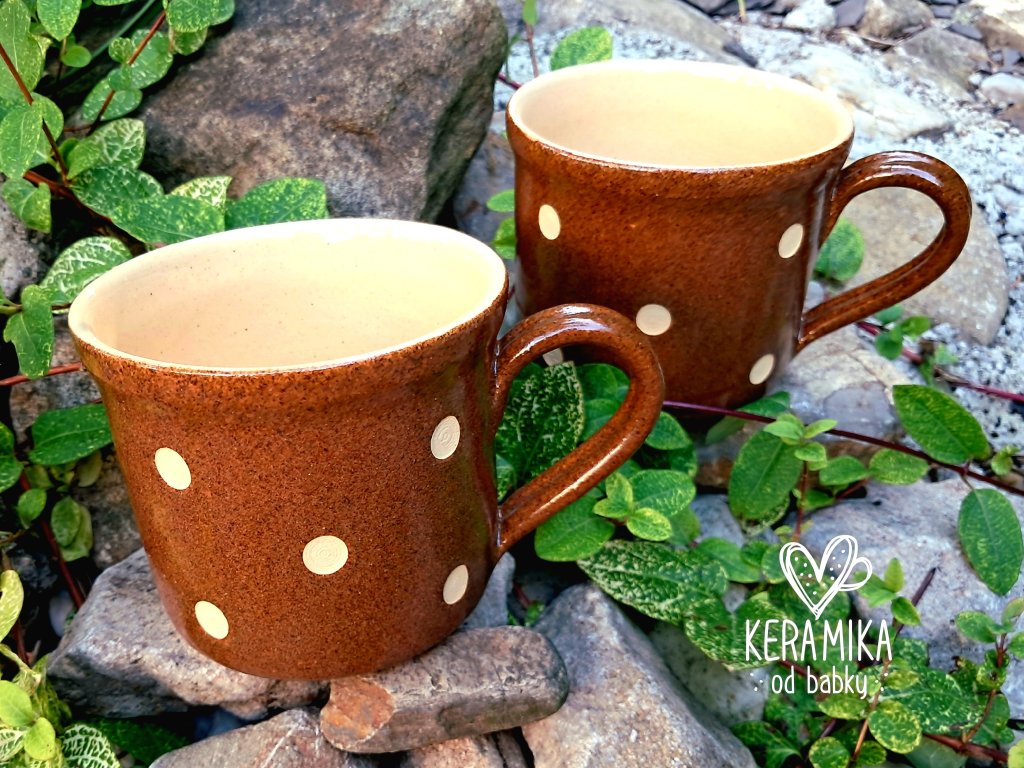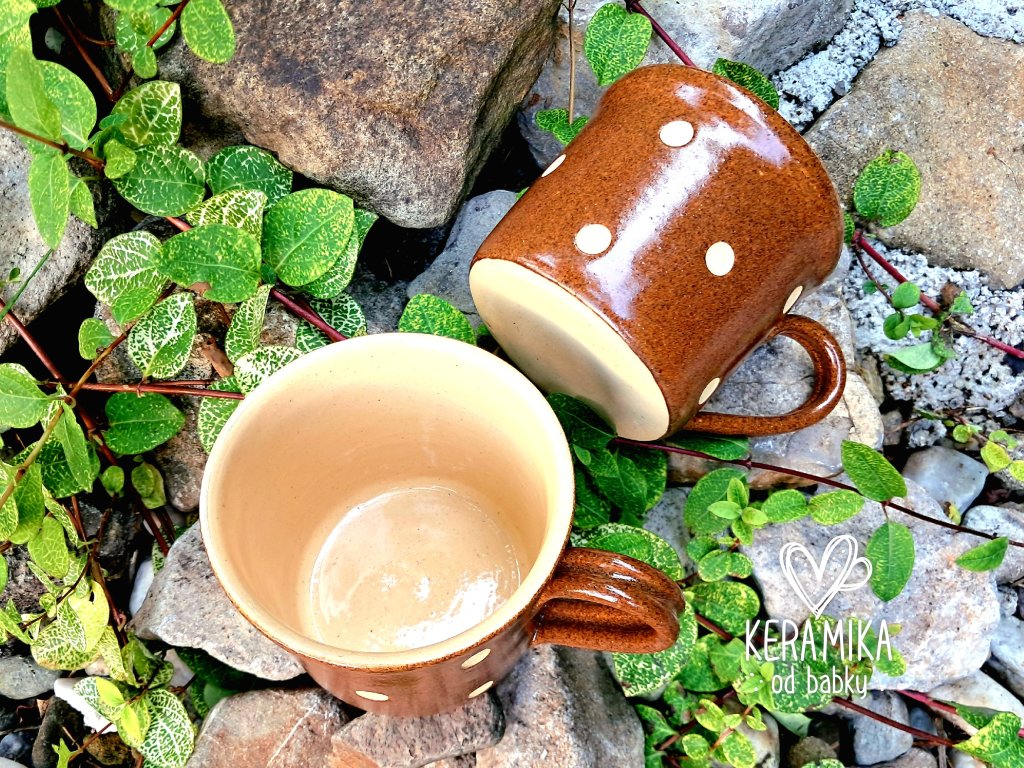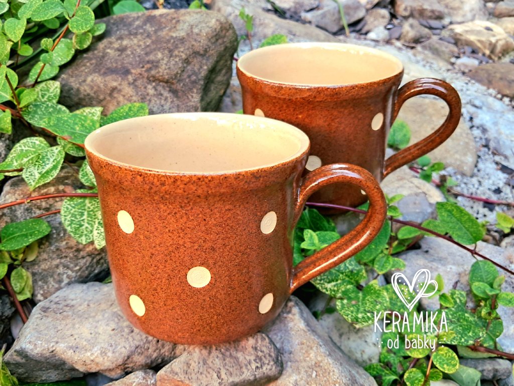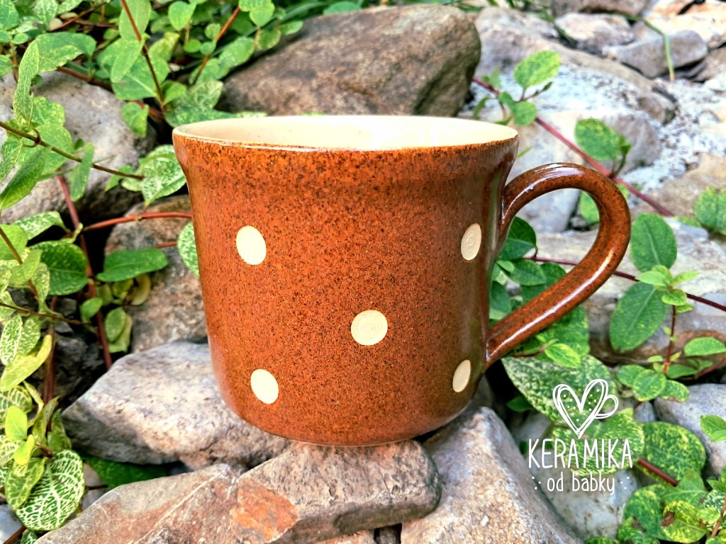 Keramický (kameninový) hrníček na teplé i studené nápoje, objem 0,4l. Hrníček má uvnitř světlou glazuru, na povrchu hnědou s broušenými puntíky. Ruční práce, každý kus je originál a může se nepatrně lišit. Možno mýt v myčce. Výška 8,5cm, průměr 9,5cm. Vyrobeno v České republice, Keramika Dub
