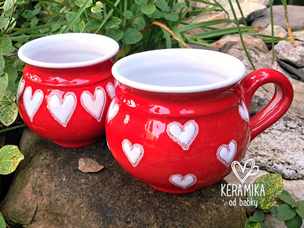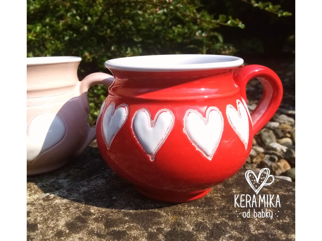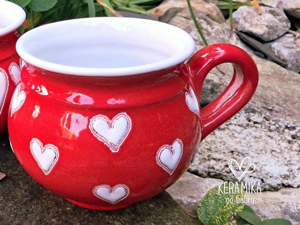 Červený keramický hrníček s vysoce lesklou glazurou, na povrchu zdobený bílými malovanými srdíčky. Ruční práce, každý kus je originál. Možno mýt v myčce. Výška 9cm, průměr cca 10cm, objem 350ml. Ruční práce, vyrobeno v České republice