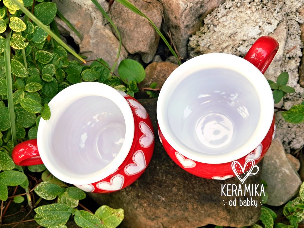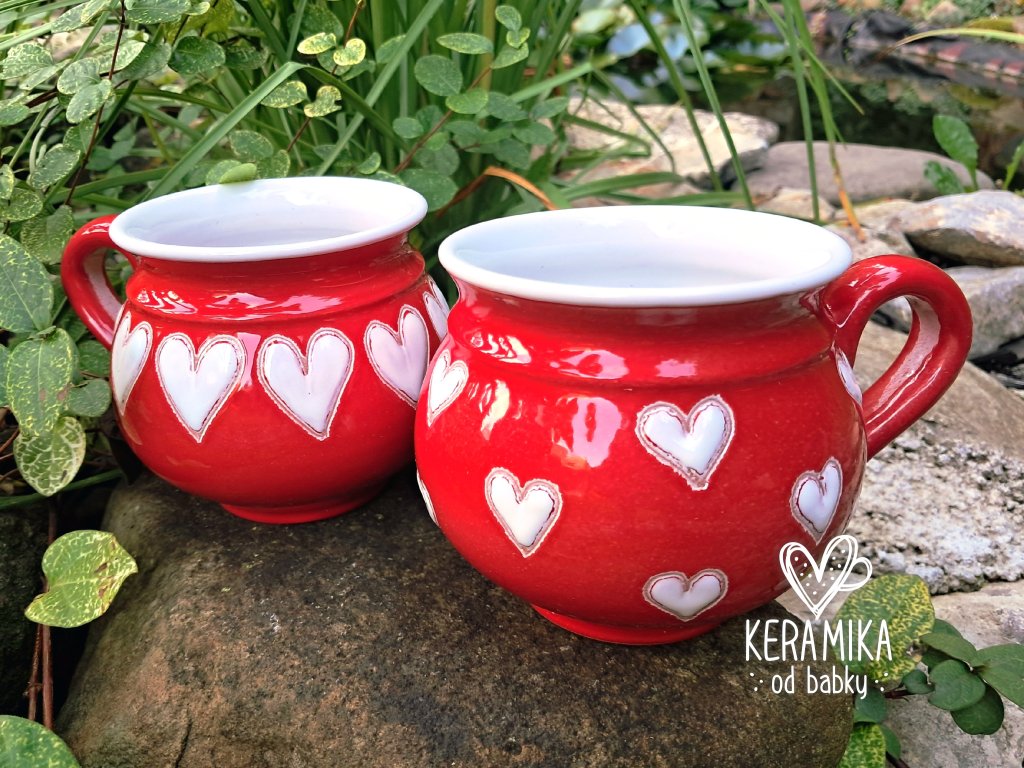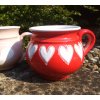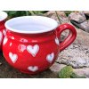 Keramický hrníček točený na kruhu s červenou glazurou a různými srdíčky, objem 350ml