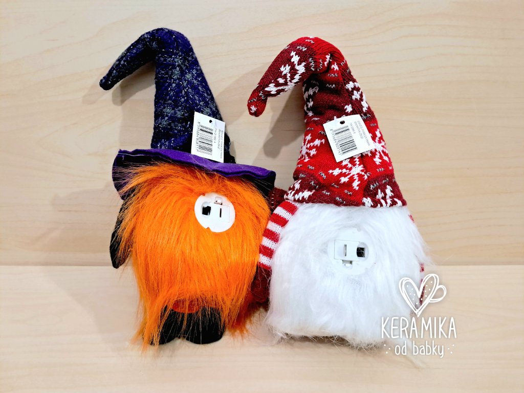 LED skřítek svítící, z pleteniny a filce, tělo plast. V čepici je tvarovací drátek. Skřítek již obsahuje vyměnitelné baterie.