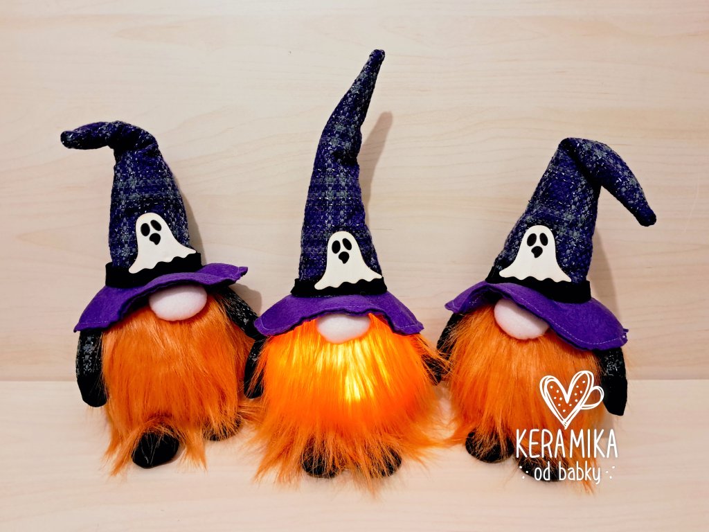 Sedící, vánoční skřítek je na baterie a večer krásně rozzáří Váš domov. Je z pleteniny a filce, tělo plast. V čepici je drátek který umožňuje čepici tvarovat. Nabízíme také v provedení na Helloween. Výška 33cm, nohy jsou dlouhé 15cm a celkově skřítek měří 48cm. Skřítek na Helloween je vysoký 33cm. Skřítek již obsahuje vyměnitelné baterie.